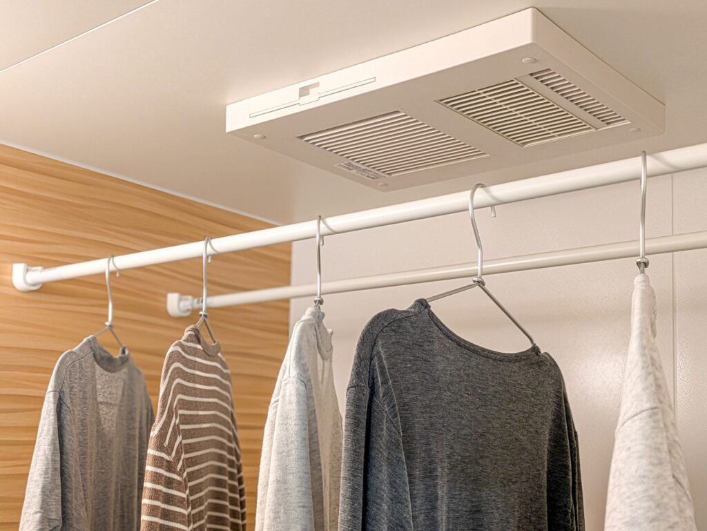 浴室乾燥機を使う際、洗濯物の位置や間隔が乾きやすさに大きく影響します。厚手の衣類や大きなタオルは、温風の通りやすい浴室乾燥機の近くに干すのが効果的です。